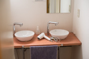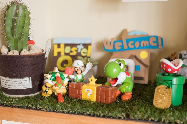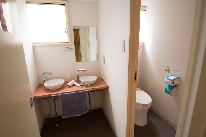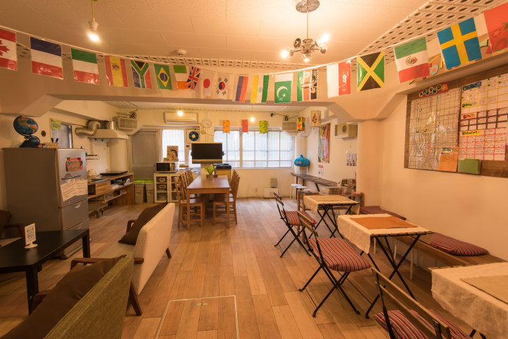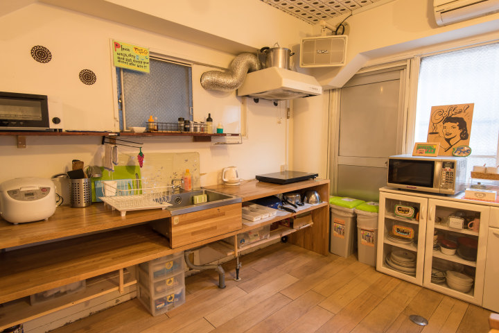 | まっさらにリニューアルされた館内。必要なものは全て揃っています。 客室は5階まで。地下はリビングキッチン。料理ができる設備も整っています。 リビングではゲスト同士が楽しくおしゃべりしています。 みんなでワイワイできるBar、大阪名物のたこ焼き屋も併設しています。 |
